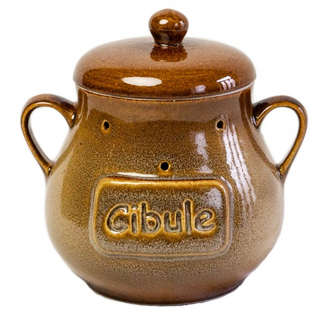 Keramická nádoba s vekom na uskladňovanie cibule.